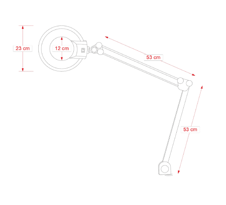 Lâmpada LED de luz fria com lente de aumento de 3x. Equipada com braço articulado e presilha para fixação em mesas ou carros de estética.